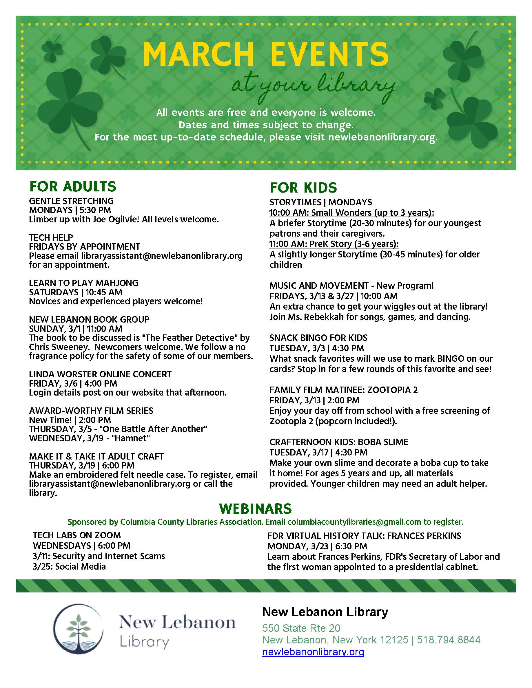Looking for fun and free activities this March? The New Lebanon Library has a full schedule of events for kids and families!