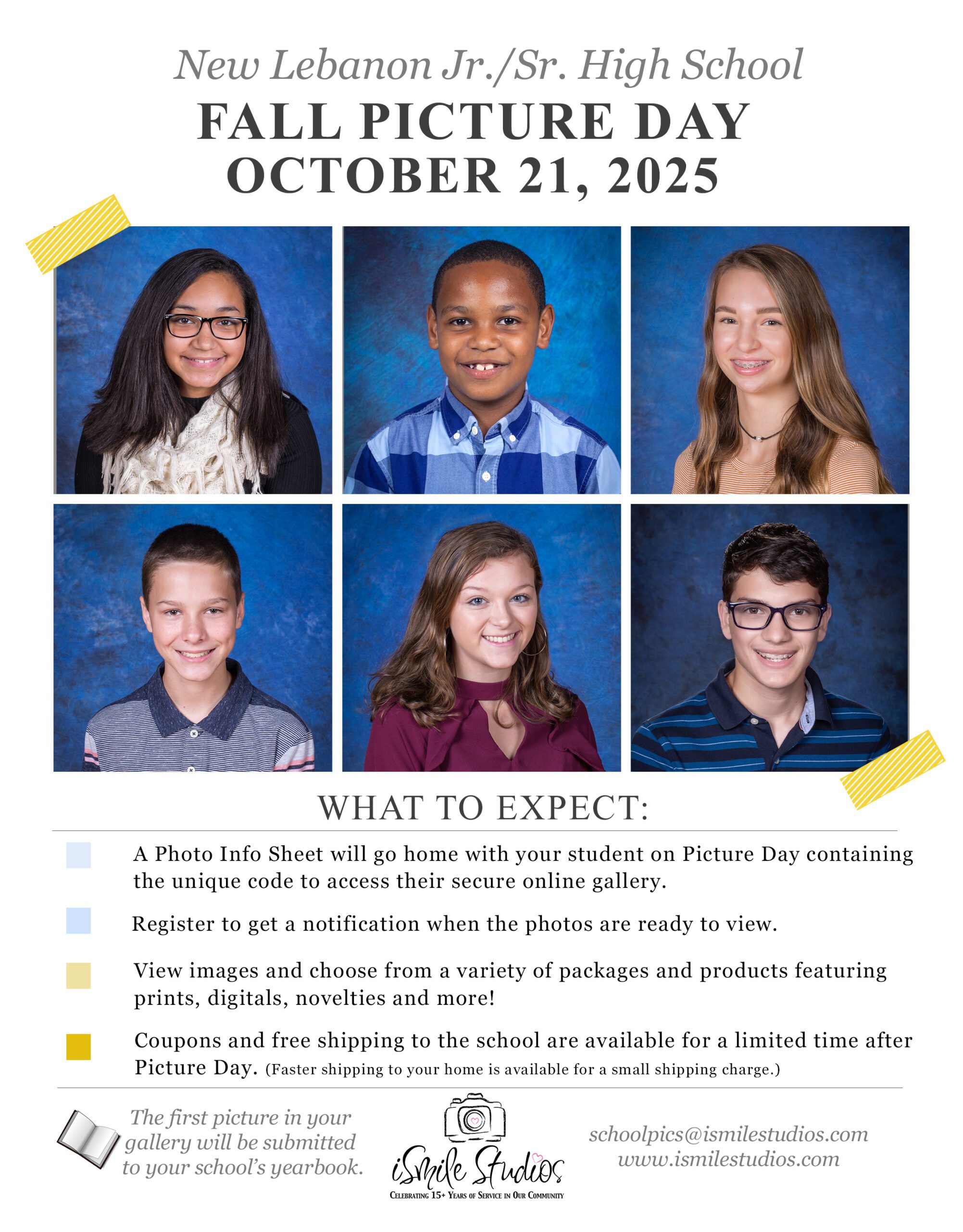 Fall Picture Day for New Lebanon Jr./Sr. High School is coming up on October 21! Students will receive info sheets with access codes to view and order photos online after Picture Day.