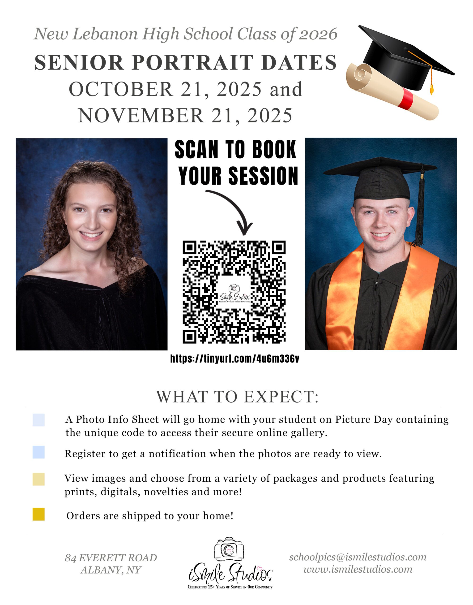 Senior portraits for the New Lebanon High School Class of 2026 are scheduled for October 21 and November 21. Scan the QR code or visit https://tinyurl.com/4u6m336v to book your session.