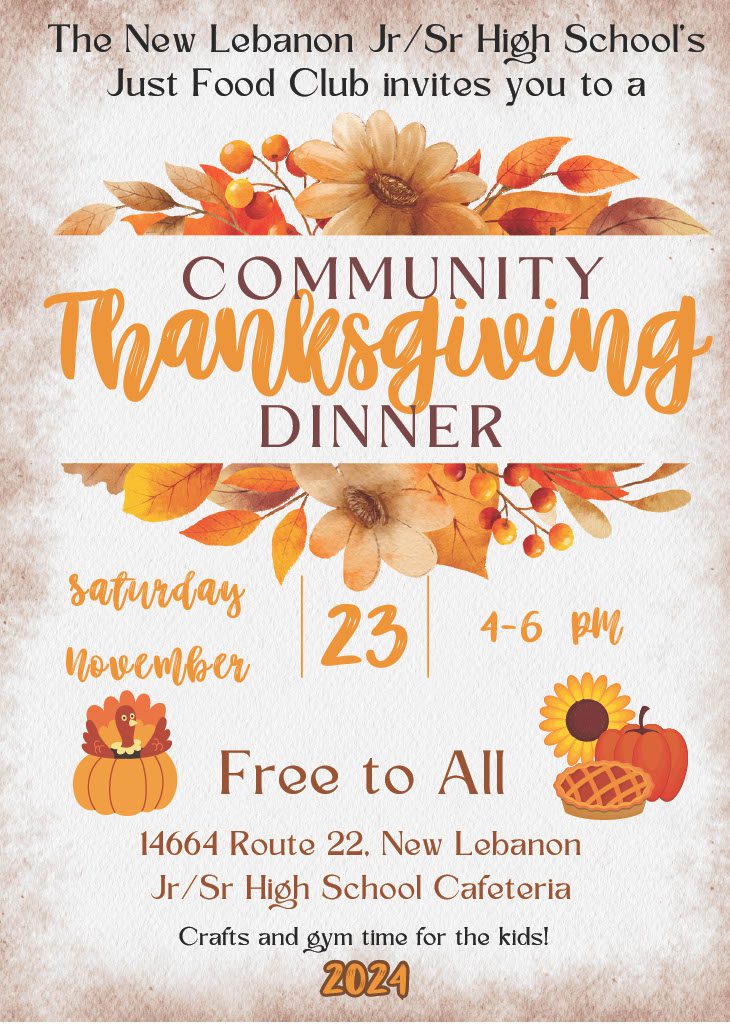 Join us for a free Thanksgiving Dinner hosted by the Just Food Club at New Lebanon Jr/Sr High School on Saturday, November 23rd, from 4-6 PM. Fun crafts and gym time for the kids! Please note this event is on the same day as the New Lebanon Travel Club Turkey Trot 5K.