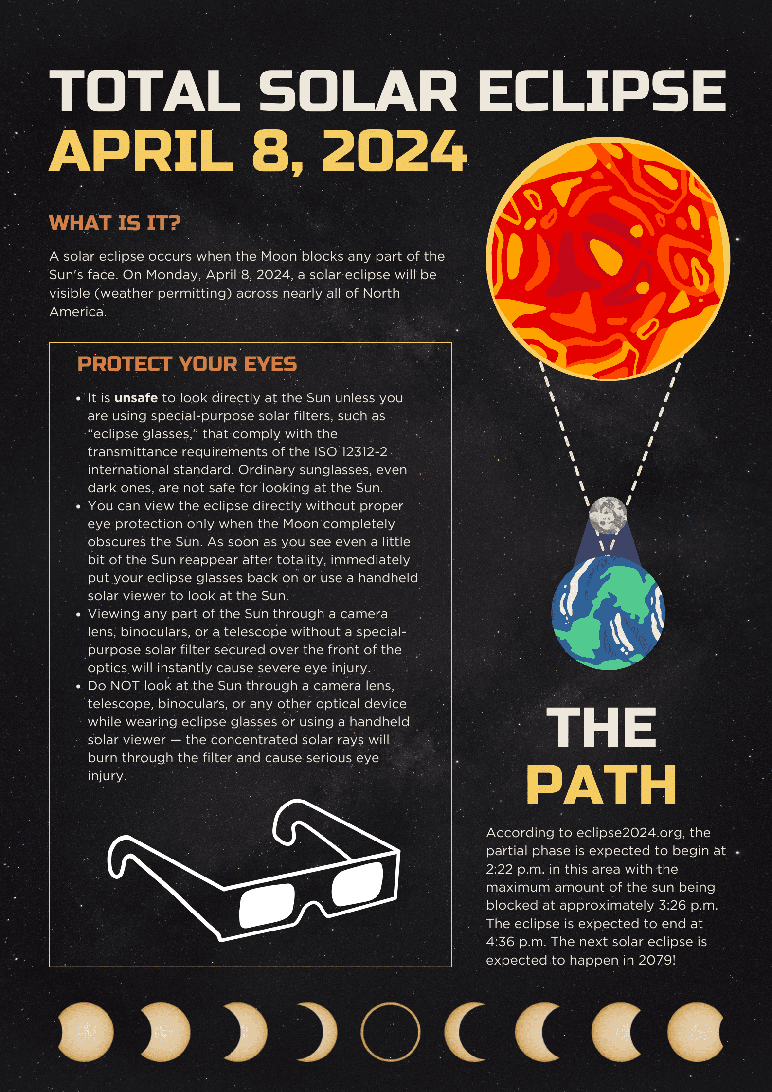 Just a reminder that we are dismissing two hours early on Monday, April 8th (The first day back from April break). This is of course due to the solar eclipse that will be going through our region from around 2:10 pm to 3:40 pm on Monday, April 8th. So that our children can enjoy the eclipse safely and not from a bus, our students at the Jr./Sr. High School will be dismissed at 12:15 pm and our students at WBH will be dismissed at 1:15 pm. Please be sure to let your child’s office know if your child has special pick up or bus arrangements.