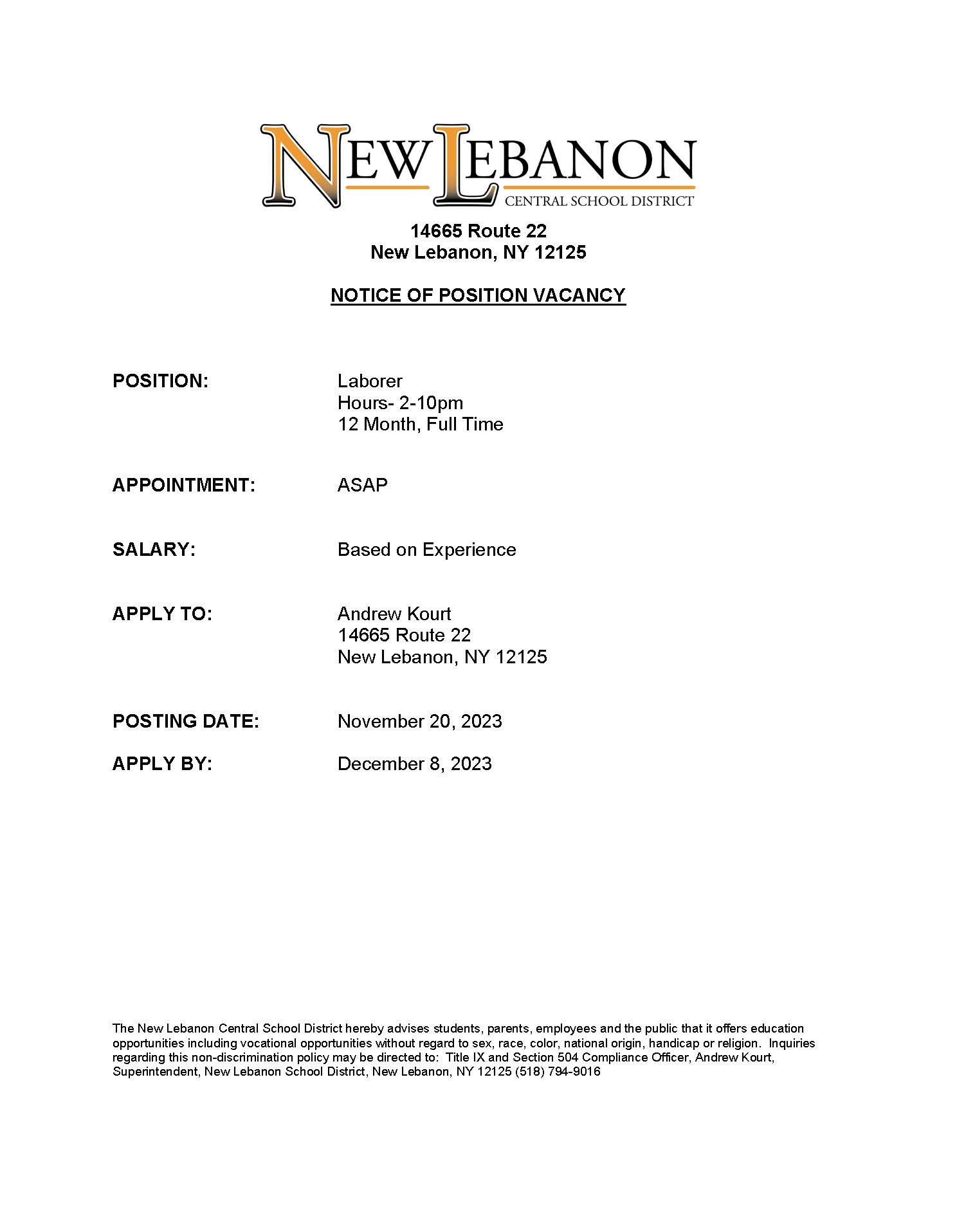 NLCSD is Hiring a Laborer NLCSD is seeking a full-time Laborer. Please see the posting below for more information.