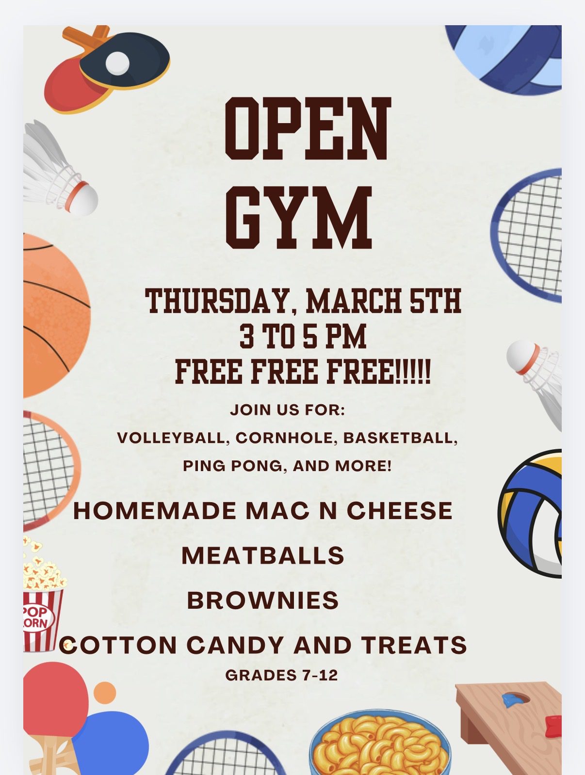 Open Gym is THIS Thursday, March 5th from 3 to 5 PM and it’s completely FREE for students in grades 7-12! Come play volleyball, basketball, cornhole, ping pong, and more. We’ll also have homemade mac n cheese, meatballs, brownies, cotton candy, and treats. See you there!