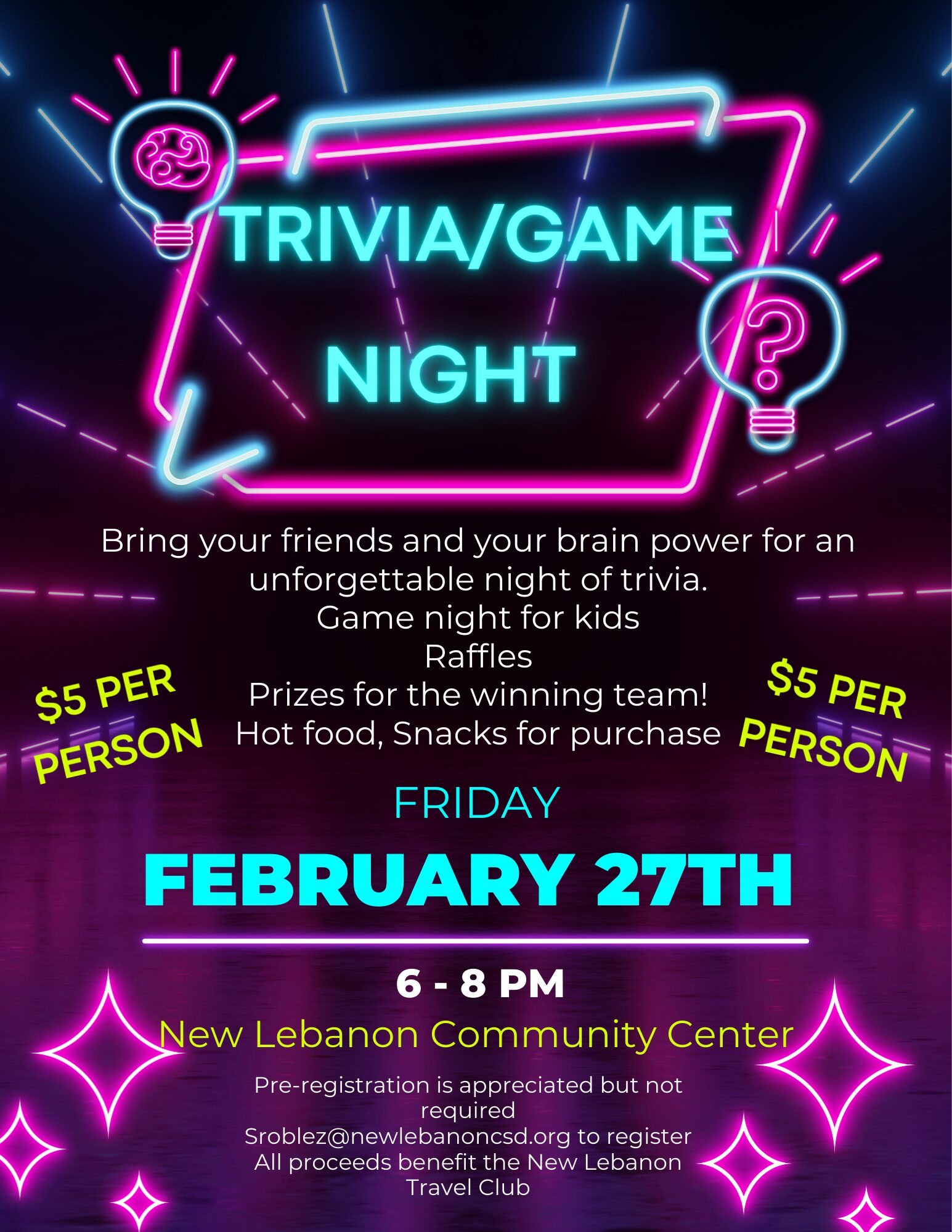 Think you’ve got what it takes? Join us for Trivia/Game Night this Friday, February 27th from 6–8 PM at the New Lebanon Community Center!
